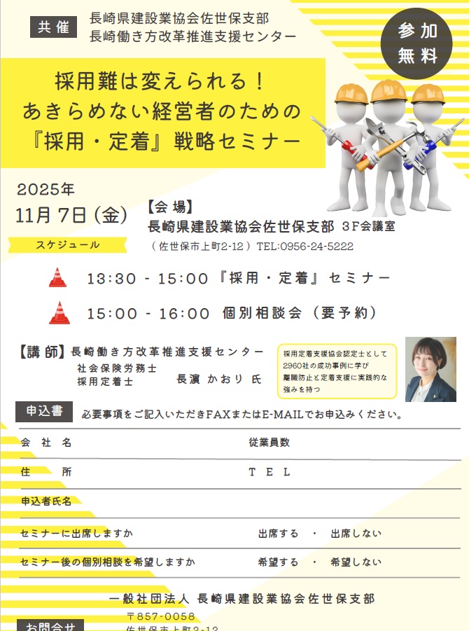 2025年11月7日(金)、長崎県建設業協会佐世保支部様において、「採用難は変えられる!あきらめない経営者のための『採用・定着』戦略セミナー」講師を担当させていただきました。